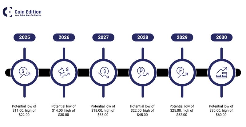 到 2030 年,Chainlink 可能会**恢复并超越其历史**水平,尤其是如果该协议继续发展成为不可或缺的预言机层的话。价格发现可能会将 LINK 推高至 60.00 美元,而平均价格将在波动中稳定在 44.00 美元附近。