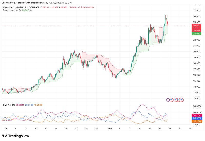 4小时图上的超级趋势指标在23.0美元上方保持看涨,提供近期支撑。同时,DMI信号显示方向强度略有减弱, DI相对于-DI有所减弱,但ADX仍保持在30附近的高位,反映出LINK仍处于趋势环境中。
