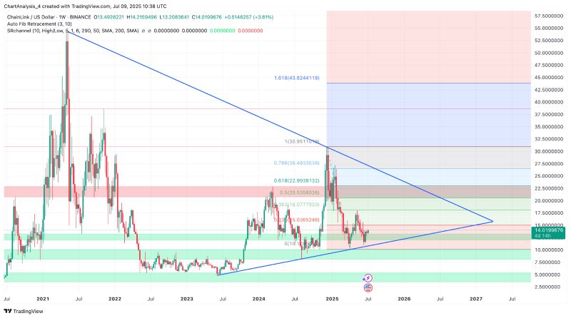 Chainlink (LINK) 正盘旋于多年对称楔形的边缘,EMA、成交量和结构都呈现出突破的迹象。尽管 15-16 美元区间仍是直接阻力位,但动能正在增强。如果多头重新夺回 200 EMA 并突破 18 美元,LINK 可能会开启下一个重要上涨通道,目标价位为 22-30 美元。长期技术面仍将支撑 2030 年。