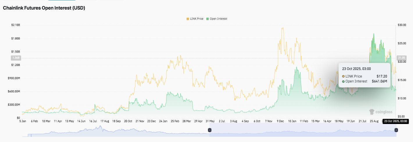 截至2025年10月23日,未平仓合约价值为6.41亿美元,而LINK交易价格约为17.20美元。这一下跌表明交易员正在减少杠杆敞口,反映出市场谨慎态度和波动性预期下降。
