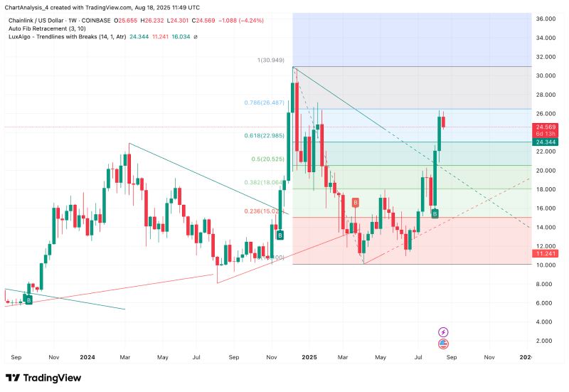 从周线来看,斐波那契回撤分析显示,LINK 在 0.786 回撤位(26.4 美元)附近出现回调,同时稳守 0.618 区域(22.9 美元)上方。这表明,只要价格维持在 23 美元以上,整体结构仍将保持看涨。