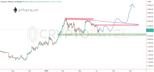 根据他的观察,绿框代表了一个重要的支撑区域,在2800美元到3000美元之间。维持这一支撑位对于对**山寨币价格的乐观预测至关重要。如果以太坊继续在这个绿**间内稳定移动,它可能会达到5000美元。