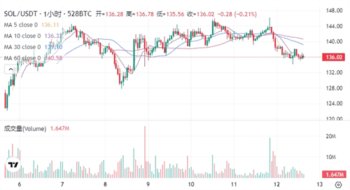 7月8日,SOL币开盘价为141.75美元,全天价格波动范围在135.73美元至143.99美元之间,收盘价为137.11美元。该日交易额为18.8亿美元,市值维持在608.13亿美元的水平。