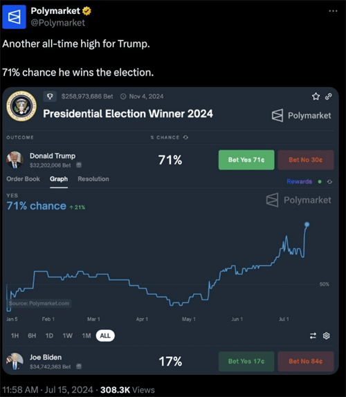 政治因素成为此次市场上涨的重要推手。上周末,特朗普遭遇的**企图被成功挫败,这一事件在热门在线**平台上进一步推高了其赢得2024年大选的**。投机者和投资者普遍认为,特朗普若能在2024年成功连任,将有利于加密货币市场的进一步发展,因此纷纷增持相关资产。此外,特朗普在**事件后宣布将继续出席7月27日在田纳西州纳什维尔举行的比特币会议并发表演讲,这一消息进一步提振了市场情绪。