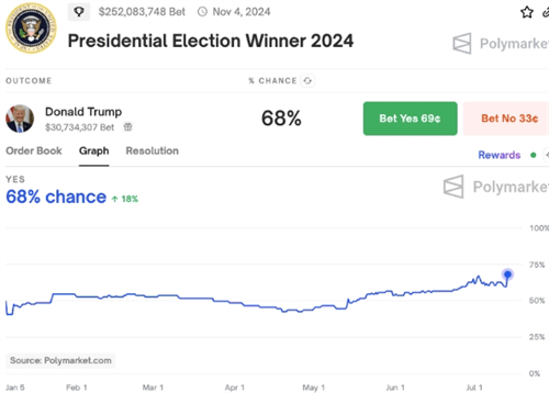 2016年特朗普胜选后,市场迅速反应,形成了“Trump Trade”,包括美债收益率走高后回落、黄金先跌后涨、美股及比特币上涨等现象。本轮“Trump Trade”开启时间提前,市场已提前布局,特朗普的枪击事件可能进一步推高其选情,并影响周一美股走势。
