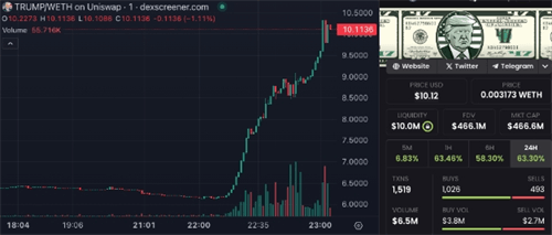 据DexScreener数据显示,**事件发生后,基于以太坊网络的MAGA模因币价格从6.31美元迅速飙升至10.36美元,涨幅超过30%。同时,其总市值也在不到45分钟内从2.93亿美元激增至4.69亿美元,显示出市场对这一突发事件的强烈反应。