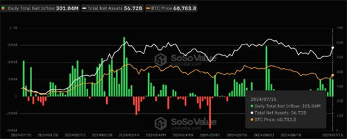 CoinShares的数据同样证实了这一趋势,显示比特币投资产品在7月8日至7月12日期间实现了周流入量13.47亿美元的历史第五高记录。SoSo Value的数据也显示,现货比特币ETF连续七周出现资金净流入,特别是在7月15日,美国11只ETF的流入资金超过3亿美元。