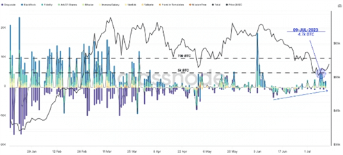 此外,Glassnode还强调了比特币ETF的持续资金流入对市场的积极影响。过去几天,所有ETF的资金流入不断,特别是在比特币价格跌破ETF持有者平均成本基础(目前为58,200美元)并触及200日移动平均线后,ETF市场**自6月初以来录得显著的正向收益,上周总流入量超过10亿美元。