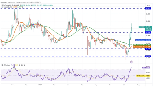 2024年7月17日,XRP币的开盘价为0.5241美元,随后在日内触及**价0.5871美元,**下探至0.5228美元,**以0.5846美元收盘。该日24小时交易额为30.96亿美元,市值达到319.99亿美元。