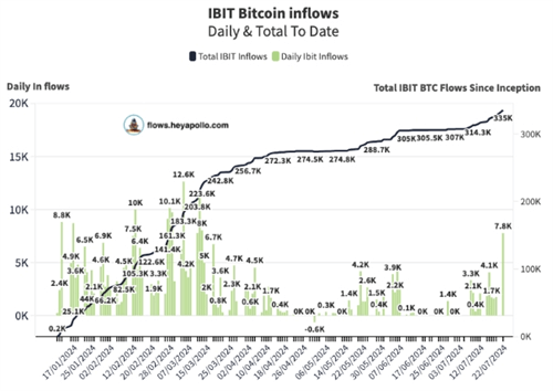 此次资金涌入使得贝莱德比特币ETF的累计资金流入达到333,000 BTC,按当前市场价格折算,相当于约220亿美元。这一表现也使7月22日成为IBIT历史上按美元计算的第七大资金流入日。