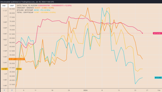 值得注意的是,2024 年迄今为止,ORDI 和 SATS 的价格分别下跌了约 34.50% 和 50%。这种下降主要是由于以比特币为首的整个加密市场日益增长的“卖出新闻”情绪。截至1月25日,ORDI和BTC的相关系数为0.66;在最近的历史中,它一直保持积极。此外,这种看跌势头与铭记费和比特币区块大小份额的显着下降相一致,凸显了对比特币序数的需求减少。铭文**的价格走势往往与BTC本身密切相关,这主要是因为Bitcoin Ordinals使用比特币的区块链。