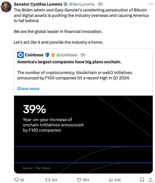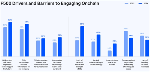 根据Coinbase的报告,2024年**季度,财富100强公司中拥有加密货币、区块链或Web3计划的公司数量同比增长了39%,创下历史新高。这些项目不仅数量众多,而且许多已进入后期完成阶段,平均预算高达950万美元。此外,Coinbase还发现,高达56%的财富500强高管表示,他们的公司正在积极开展区块链项目。