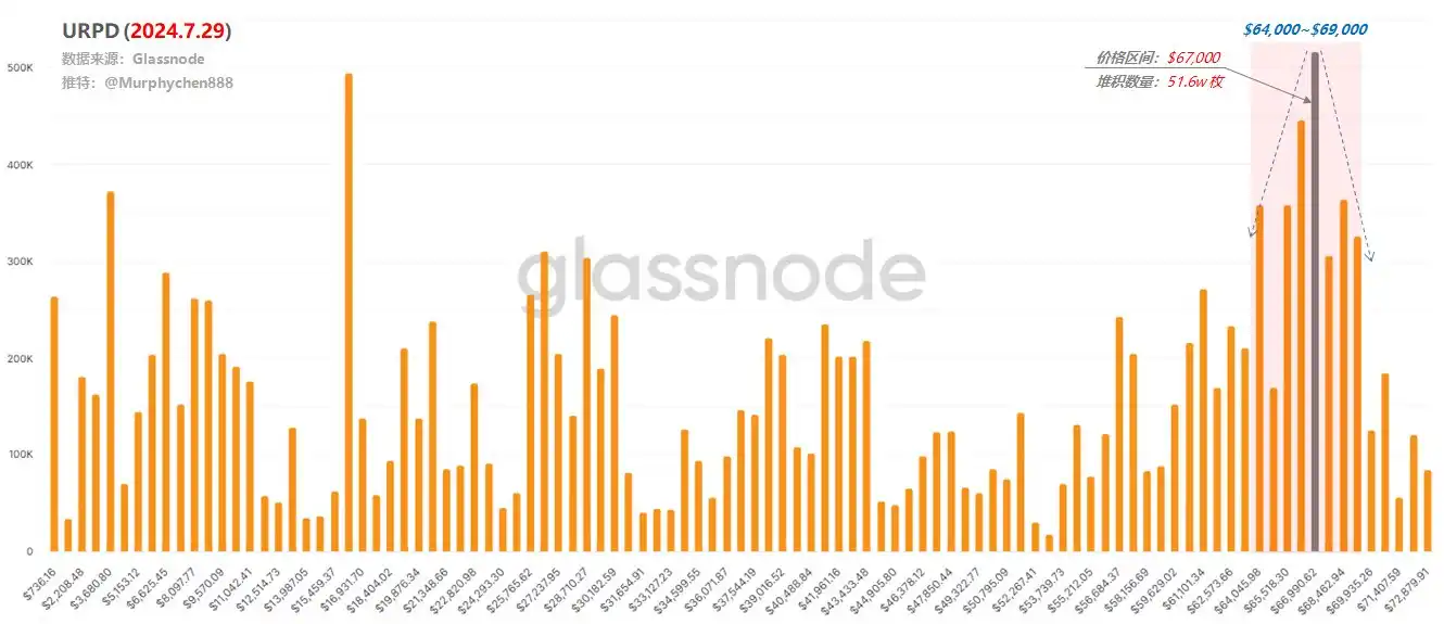 当时在$64,000~$69,000 形成筹码堆积区,在$67,000 处产生了一个堆积了 52w 枚 BTC 的巨量柱,并以此为**峰值向两边递减,形成区域性价格支撑。相信小伙伴们还记得,在此后很长一段时间 BTC 的价格都没有效跌穿过这个价格区间。即便是 8 月 5 日和 9 月 7 日的开始远离该区间,但该区间筹码结构始终未被**。在一段时间后,BTC 价格又会回到该区间(产生引力)。
