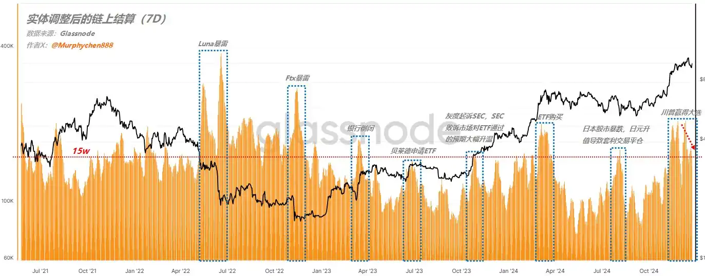 每一次推动市场情绪变化的事件发生,都伴随链上换手量的突然**。经过数据筛选,把同一实体地址集群的转账剔除后,通常每日链上真实换手量大致在 10w 枚 BTC 左右(7 日平均),工作日多一些,周末少一些;如果超过 15w 枚,就是一个「非正常」的数据。