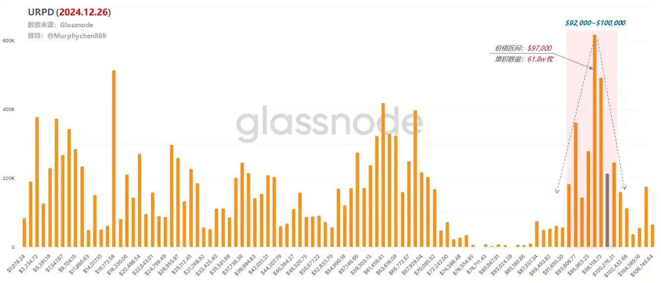 从当前的数据看,链上结构正在$92,000~$100,000 范围内逐步形成筹码堆积区,其中$97,000 处产生了一个高达 60w 枚 BTC 巨量柱,并以此为**峰值向两边递减。