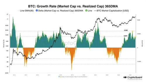 这位分析师还分享了另一张图表,以巩固看涨前景。这位交易员使用“增长率”指标来比较比特币市场的变化和实现的上限。