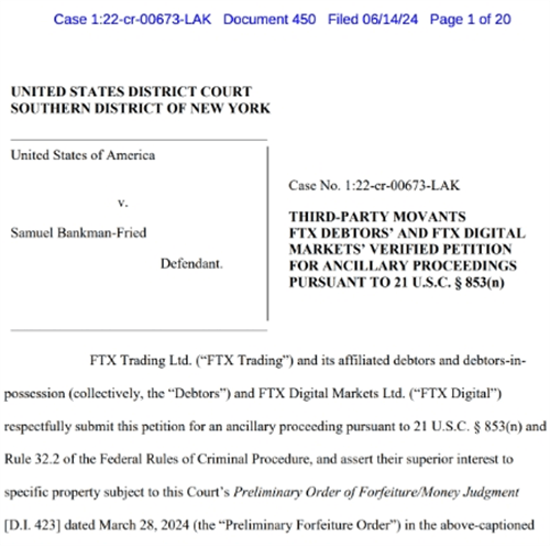 6月14日,代表FTX债务人及其巴哈马实体FTX Digital Markets的律师团队向美国纽约南区地方法院提交文件,主张对可用于满足法院对Bankman-Fried的110亿美元判决的资产拥有优先权。他们声称,包括FTX的飞机、在多家银行持有的资金、Robinhood股票的出售收益以及与前FTX高管的政治捐款等资产,不应用于Bankman-Fried的刑事判决,而应优先用于赔偿已倒闭交易所的受害者。