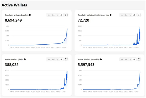 此外,TON网络上的日活跃钱包已超过38.8万个,月活跃钱包超过550万个。加密研究人员Leon Waidmann指出,TON活跃钱包的增长甚至超过了Coinbase的第二层(L2) BASE,为加密行业的增长和采用设定了新的标准。