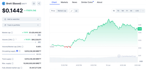 6月20日**消息报道,在表情包币市场经历了艰难的一周后,像$BRETT和$PEPE这样的**正在迅速回归。在过去的24小时里,布雷特上涨了16.5%,而佩佩上涨了5.2%。在过去的7天里,这两种**都下跌了25%以上。