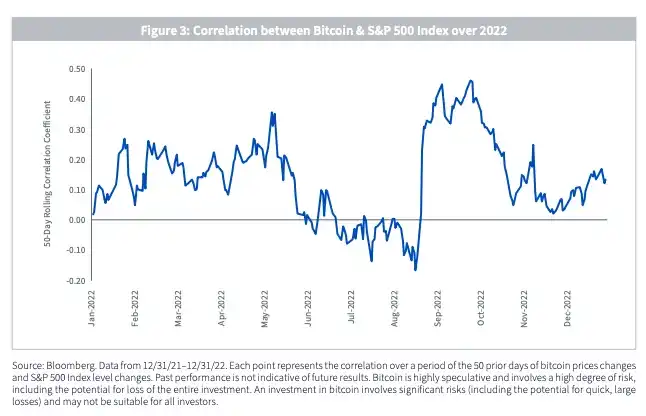 图表展示了 2022 年比特币价格与标普 500 指数之间的 50 天**相关性。从平均水平来看,相关性约为 0.1 ,高点超过 0.4 ,低点则低于-0.1 。来源:WisdomTree