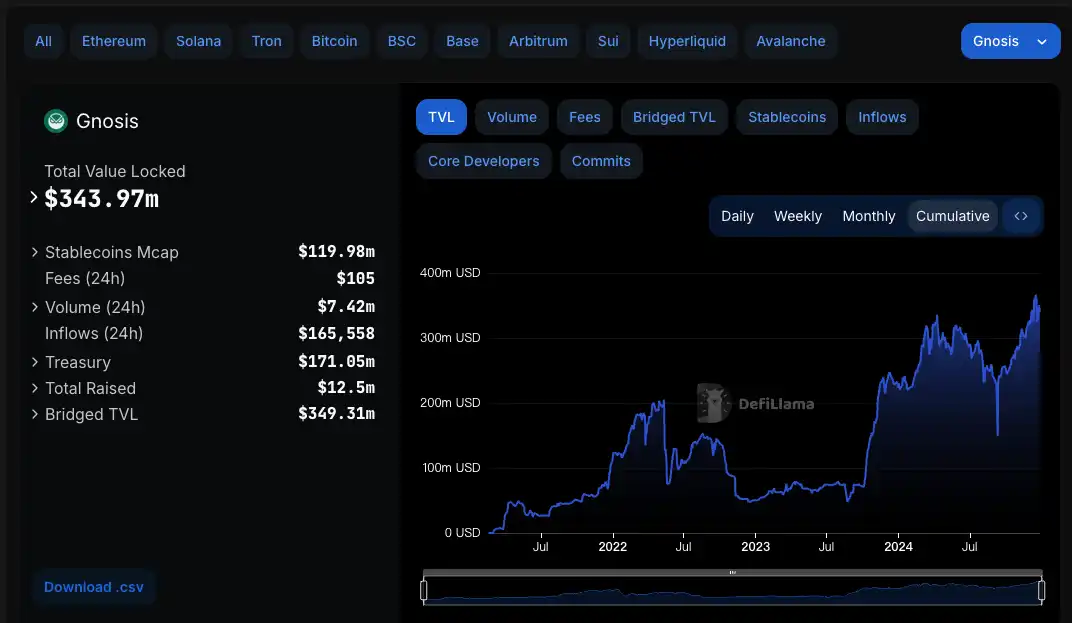 Gnosis Chain,这是上一轮周期里比较出名的以太坊侧链,专注于**、安全的去**化应用构建。根据 DefiLlama 数据,截至撰写本文时,Gnosis Chain 的锁仓总价值(TVL)为 $349.31M,其中包括 $71.61M 的原生资产和 $277.7M 的跨链桥接资产。稳定币市值达 $119.98M,其中 DAI 占比 74.07%,交易量保持稳定。