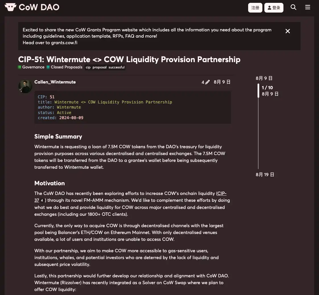 Wintermute 提议从 CoW DAO 的财库中借出 750 万个 COW **,用于支持去**化和**化交易平台的流动性。这项提案得到了社区的大力支持,并正式开启了 $COW 流动性的新篇章。