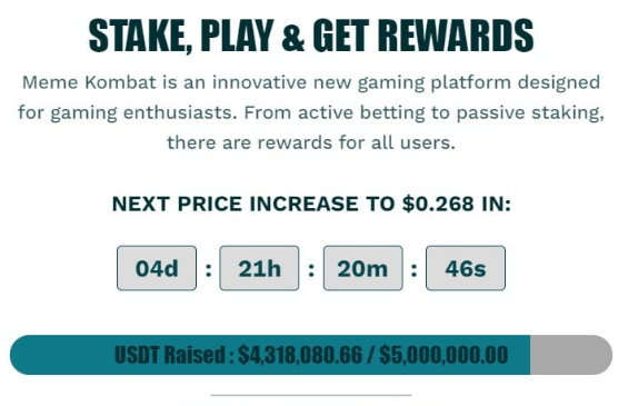 Meme Kombat是Web 3游戏竞技场的开拓者,已经筹集了超过430万美元,接近其500万美元的目标。其原生Meme Kombat Token($MK)的价格将在不到5天的时间内升至0.268美元,这反映了加密社区的热情日益高涨。