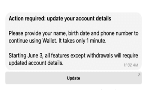 Wallet在公告中指出:“自6月3日起,除提款外的所有功能都将需要更新的账户详细信息。”