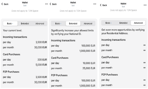 此次Wallet的新KYC系统给用户体验带来了巨大变化。在更新之前,使用Telegram Wallet的默认版本时,部分用户无需提供**个人信息,而另一些用户则需要提供一些数据。此次更新后,用户必须通过至少一些信息验证,以获得“基本”识别**。该**限制每日加密交易额为3500欧元(约合3780美元),每月为35000欧元(约合37800美元),此级别的验证无需**文件。