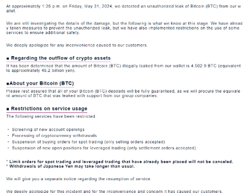 此次黑客攻击的细节逐渐浮出水面。据Whale Alert分析平台发布消息称,“4,502 #BTC(当时价值308,948,771美元)从未知钱包转移到未知的新钱包。”随后,DMM交易所在其网站上证实,该笔巨额比特币的流失正是由于黑客攻击所导致。