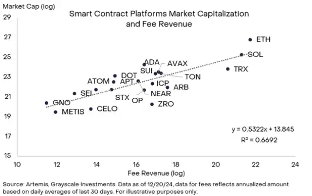 如图 4 所示,智能合约平台费用收入与市值之间存在统计关系。网络产生费用收入的能力越强,网络以**销毁或质押奖励的形式将价值传递给网络的能力就越大。本季度,Grayscale Research 列出的 Top 20 **列表包含了一些智能合约平台**:ETH、SOL、SUI 和 OP。