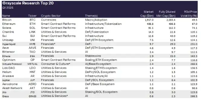 · Grayscale Research 更新了 Top 20 **列表。该列表代表了加密货币行业的多元化资产,这些资产在未来一个季度可能具有很高的潜力。2025 年 Q1 新增的资产包括 HYPE、ENA、VIRTUAL、JUP、JTO 和 GRASS。Top 20 列表中的所有资产都具有较高的价格波动性,应被视为高风险。