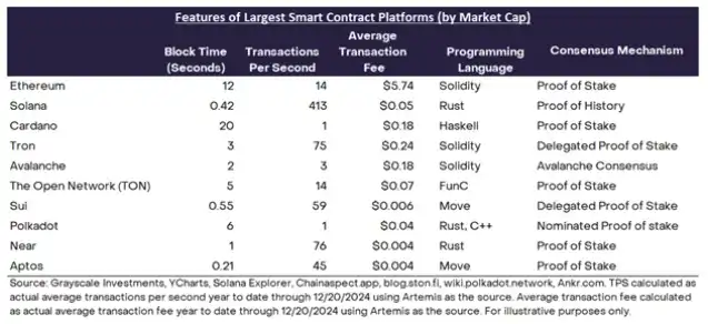 智能合约平台领域可能是数字资产行业中竞争最激烈的细分市场。虽然 2024 年对于该领域的领导者以太坊来说是具有里程碑意义的一年——以太坊获得了美国现货交易所交易产品(ETP)的批准,并进行了重大升级——但 ETH 的表现不及某些竞争对手,如 Solana,后者是该领域中市值第二大的资产。投资者还将注意力转向了其他 L1 网络,包括 Sui 等高性能区块链以及与 Telegram 平台集成的区块链 TON。