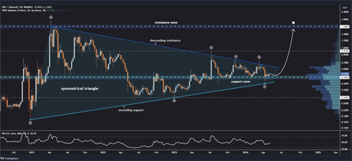 最近4月份的价格下跌反映了更广泛的市场调整,瑞波币重新测试了对称三角形的较低趋势线。