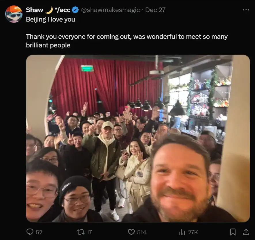 Shaw:我觉得可能是因为这些人都愿意亲自到世界各地去和社区互动,愿意接触那些真正为行业做贡献的人。这种主动参与的态度本身就很重要。一方面你知道,去见见大家、自己建立联系是件好事。但另一方面,像 Vitalik 这样的人,他会想要见每一个人,想要和人们在一起。这种特质是他整个理念的核心之一,我对此非常有共鸣。美国很强大,但人口相对很少,而**既强大又人口众多。我们是两个超级大国,虽然在政府层面存在一些冲突,但作为人类,我们其实是一样的,我们真的是一起在努力。