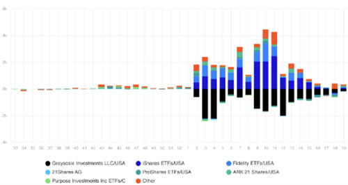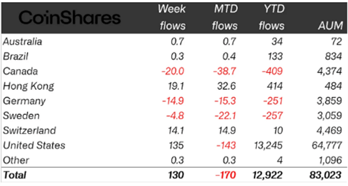 从地区分布来看,美国、瑞士、香港、澳大利亚和巴西是资金流入的主要来源地。而加拿大则出现了**的区域资金流出,达到2000万美元。这一数据反映出全球各地投资者对加密货币市场的不同态度和风险偏好。