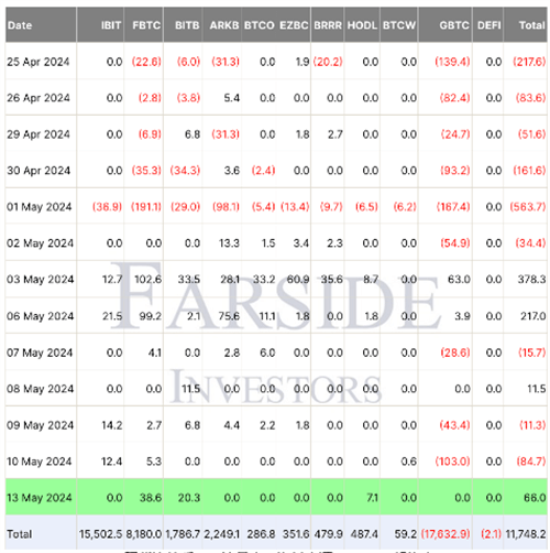 根据Farside Investors的数据,机构资金继续流入美国现货比特币ETF,创下自5月6日以来的**流入量。其中,Fidelity、Bitwise和VanEck的现货比特币ETF基金是促成5月13日资金流入的主要产品。特别是Fidelity的比特币基金,在当天吸引了高达2030万美元的资金流入,成为市场表现最亮眼的基金之一。