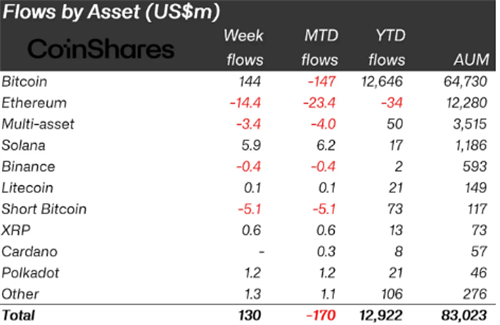 这一资金流入的主要推动力来自比特币投资基金,该类基金在上周吸引了高达1.44亿美元的资金流入。这一数字不仅占据了市场资金流入的绝大部分,也进一步证明了比特币在加密货币市场中的核心地位。