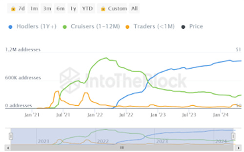 尽管分析平台IntoTheBlock (ITB)的当前数据显示,DOGE的长期表现仍优于SHIB,但从成本的角度来看,SHIB开始在短期内将自己定位为优于DOGE。根据ITB的持有时间指标,在过去30天内,DOGE的持有者数量增加了1.86%,而SHIB的持有者数量增加了0.43%。持有资产超过一年的被动投资者。