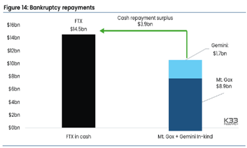 根据K33 Research分析师的**报告,FTX交易所计划向债权人偿还的现金可能会在加密货币市场催生一波乐观预期。该计划预计将向因交易所破产而受损的用户支付至少145亿美元的现金,在5月16日由分析师Vetle Lunde和Anders Hesleth发布的这份报告中,他们认为,与普遍的看法相反,“并非所有债权人的还款都会对市场产生负面影响。”为了支持这一观点,他们将FTX的预期现金还款与Mt. Gox和Gemini计划的基于加密货币的还款方式进行了比较。据报告,后两者的还款计划“目前估值合计为106亿美元”。