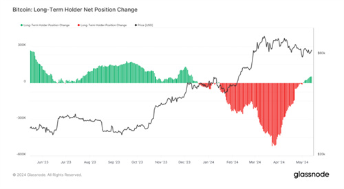 Glassnode的**5月16日数据显示,比特币长期持有者正在利用比特币较低的价格大幅增持比特币。这种积累进一步增强了这群比特币投资者的信念,即尽管比特币最近波动很大,但他们仍预计比特币可能会上涨。