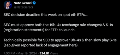 然而,市场也存在不确定性。ETF Institute的联合创始人兼ETF Store总裁Nate Geraci提醒,SEC可以独立于基金注册(S-1)批准交易规则变更(19b-4s),这可能会推迟到VanEck以太坊现货ETF请求的5月23日截止日期之后。此外,与涉及权益证明(PoS)加密货币的结构相关的复杂性和风险也可能影响监管机构的审批进程。