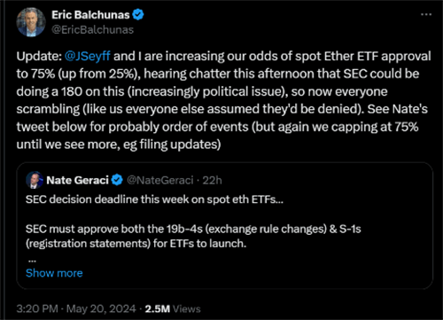 5月20日,以太坊价格飙升至3685美元,此前彭博社**分析师Eric Balchunas将以太坊ETF的批准几率从25%上调至75%。Balchunas指出,美国证券交易委员会(SEC)可能面临外部政治压力,因其之前与ETF申请人的沟通较少。此外,有报道称SEC正要求各大交易所更新备案文件,尽管监管机构尚未正式确认此消息。