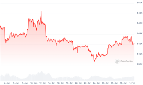 尽管所有10只现货比特币ETF在1月份的总持仓增加了3%,但比特币在过去30天内价格大幅下跌。根据CoinGecko的数据,今年年初比特币价格约为45,000美元,但随后出现了大幅波动,1月23日跌破39,000美元。截至发稿时,比特币的交易价格为42,215美元,过去30天内下跌约8%。