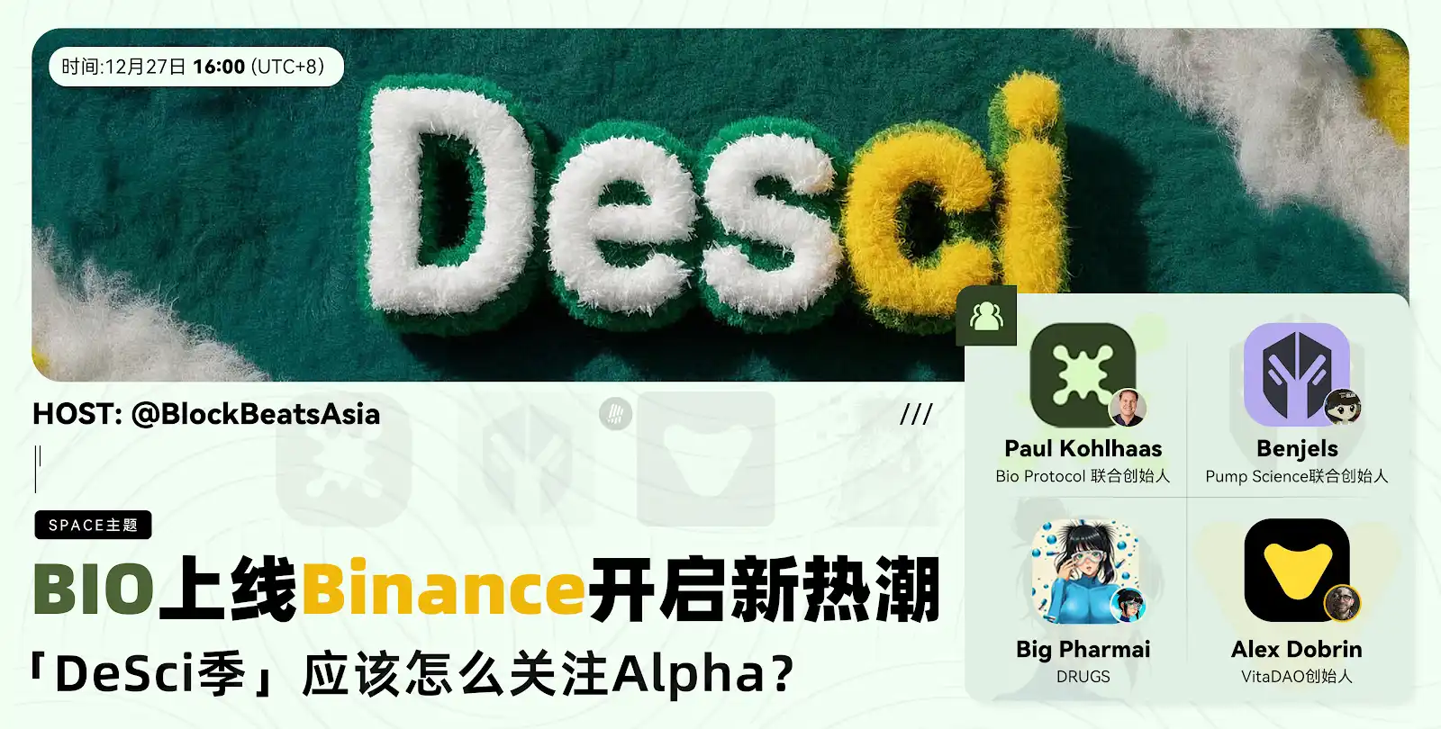 随着 Bio Protocol 上线 Binance,DeSci 赛道逐渐被越来越多的人关注。12 月 27 日,BlockBeats 邀请到 DeSci 赛道领军人物 Bio Protocol 联创 Paul Kohlhaas,Pump Science 联创 Benjels,VitaDAO 创始人 Alex Dobrin,以《BIO 上线 Binance,DeSci 季应该怎么找 Alpha》为主题,聊聊 DeSci 赛道应该如何关注 Alpha