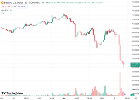 根据TradingView的数据,北京时间3月2日凌晨,比特币在30分钟内从69450美元暴跌5%,至**65970美元。
