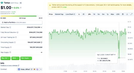在比特币闪电崩盘的同时,与美元挂钩的稳定币泰达币(USDT)的价值也出现了约1%的波动,根据CoinGecko的数据,其价格短暂地从1美元的锚定价格跌至0.988美元。