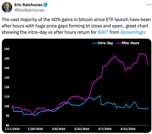 彭博ETF分析师Eric Balchunas也在4月5日的帖子中指出,自1月11日现货比特币ETF推出以来,比特币“40%的涨幅”中的大部分发生在美国市场常规交易时间之外。
