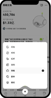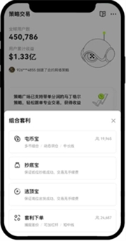 2.在首页找到并点击【交易】按钮,然后选择【策略】选项,接着进入【组合套利】页面。