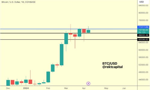 另一位知名交易员Rekt Capital在查看周线图时表示:“比特币目前正在试图突破这个蓝**间的高点(7.13万美元)。”